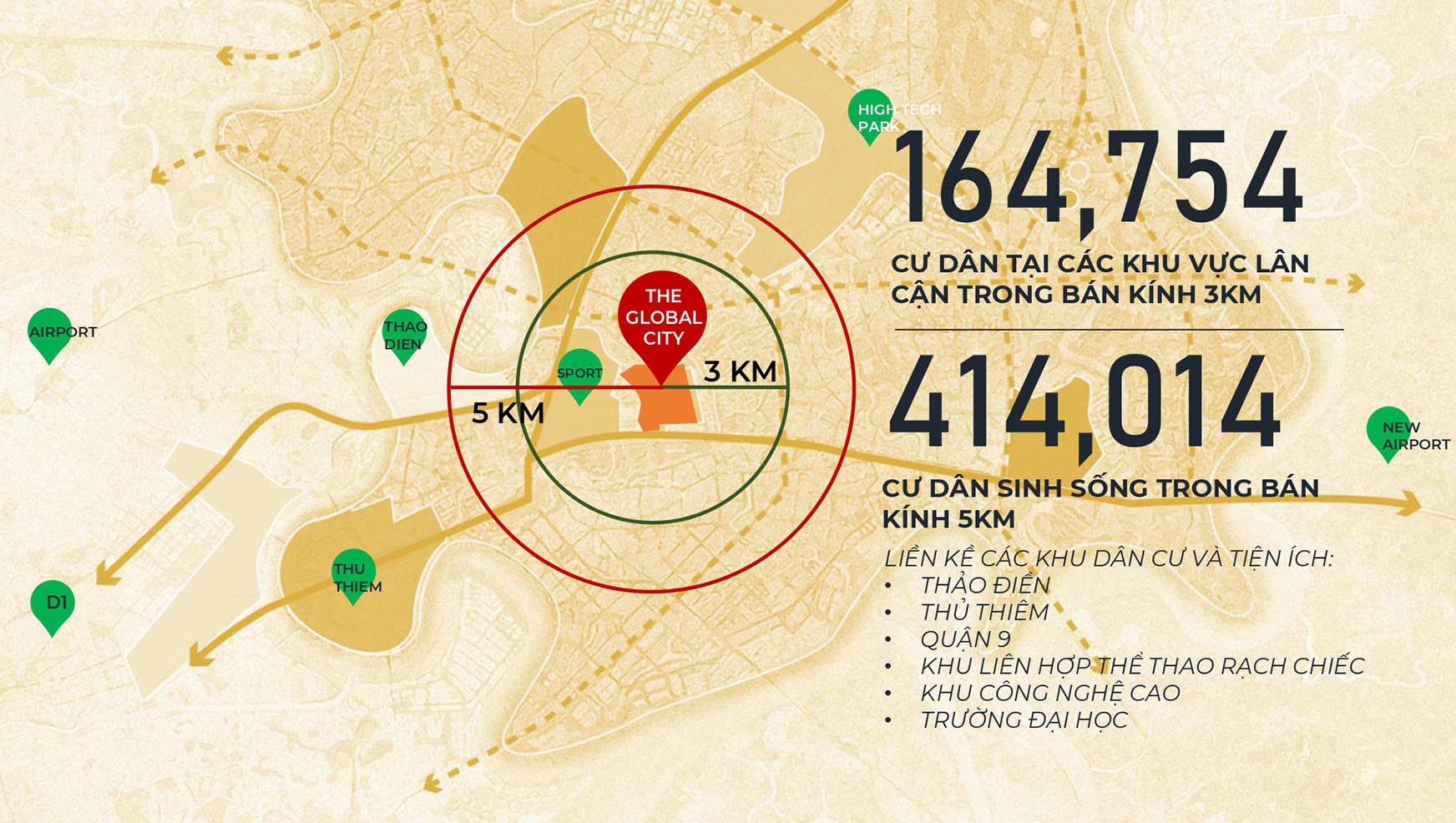The Global City tọa lạc liền kề hai khu đô thị quy mô lớn: Sài Gòn Sports City và Nam Rạch Chiếc – trung tâm tổ chức các giải đấu thể thao chuyên nghiệp, sự kiện diễu hành, giải trí và là điểm đến sôi động thu hút hàng ngàn du khách mỗi năm.
