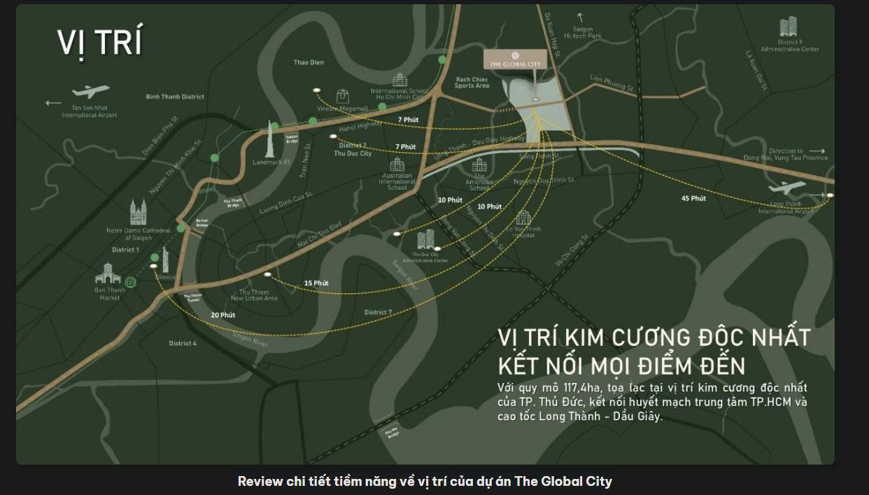Tọa lạc tại khu đất vàng rộng 117ha thuộc phường An Phú, TP. Thủ Đức – trung tâm mới của TP.HCM, The Global City sở hữu vị trí chiến lược hiếm có. Dự án tiếp giáp với bốn trục giao thông huyết mạch: Đỗ Xuân Hợp, cao tốc Long Thành – Dầu Giây, Liên Phường và xa lộ Hà Nội, mang đến khả năng kết nối linh hoạt và nhanh chóng đến trung tâm thành phố.