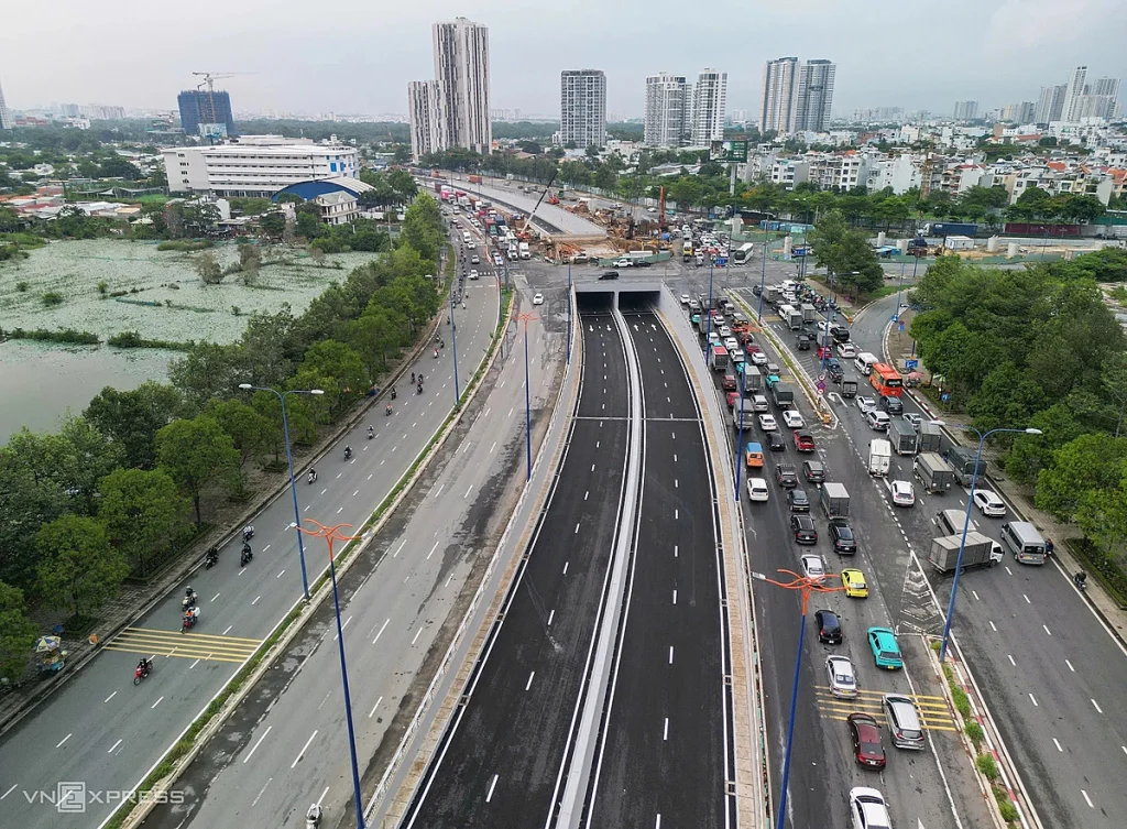 Ngày 30/6, hầm chui 4 làn xe thuộc nút giao An Phú (TP Thủ Đức) chính thức thông xe sau hai tháng điều chỉnh tiến độ. Hầm dài hơn 450 m, rộng 20 m, cho ô tô lưu thông hai chiều – mỗi chiều hai làn, giúp phân luồng hiệu quả và giảm ùn tắc tại cửa ngõ phía Đông TP HCM. Tuy nhiên, xe máy và container không được phép lưu thông qua hầm.